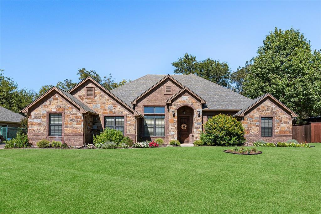 PACK UP THE FAMILY and head to Pecan Plantation where you can enjoy the amenities of city life in a beautiful rural setting. This lovely 4-3-2.5 brick and stone home is just across the street from the historic Brazos River, with a hilly backdrop, in a quieter stretch of this gated, golfing community. Fantastic curb appeal. One-story, open concept floor plan. Varied, dramatic ceiling treatment in every room. Upgraded crown and lighting. Stone fireplace (electric) in living room, which boasts large windows that invite light and offer a view of the orchard, with its amazing wildlife and birds. Kitchen has granite counters, knotty alder wood cabinetry, stainless appliances and a nice corner pantry. Floor plan includes a formal dining room and breakfast area. Office conveniently located at front of house with French doors. Plantation shutters on front of house. Roomy primary en suite features granite counters, open shower, dual vanities and walk-in closet. Pet and kid-friendly, easy care flooring of ceramic tile and luxury plank vinyl. Fenced; sprinklered yard. Landscape uplighting of house, and stone mailbox. Dedicated vegetable garden on drip system. Plantation Beach park access within walking distance. NEW ROOF & GUTTERS JULY 2025. Photos of insulated attic storage and floorplan in MLS transaction desk. Pecan amenities include clubhouse, pool, marina, campground, stables, archery range, 2 airstrips, VFD & EMS inside gates. Also, business village with Brookshire's grocery store, medical clinic, pharmacy, veterinarian, restaurants, carwash, and more. Minutes from Lake Granbury and historic downtown Granbury with quaint shops, restaurants, opera house, art galleries, and weekend activities. 1 hour from Ft. Worth.