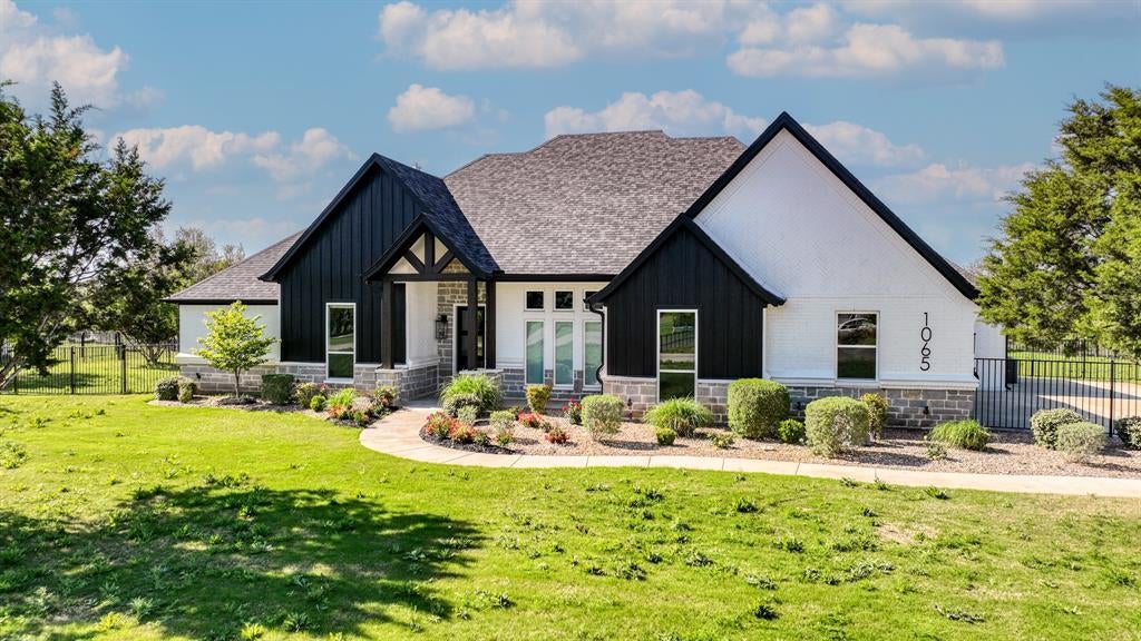 Welcome to your dream home nestled on a picturesque, tree-filled 2-acre lot in beautiful Parker County. This stunning property offers the perfect blend of rustic elegance and modern comfort with its open-concept layout, soaring vaulted ceilings, and exposed wooden beams that create a warm and inviting atmosphere. Step into the spacious living area where natural light pours in, enhanced by motorized shades throughout the entire home—offering effortless control and privacy at the touch of a button. The seamless flow into the dining and kitchen spaces makes this home ideal for entertaining or enjoying cozy nights in. The heart of the home extends outdoors to a covered back patio featuring a wood-burning fireplace, perfect for relaxing evenings under the stars. The oversized primary suite is your private retreat, boasting a luxurious bathroom with ample space, dual vanities, and a spa-like ambiance. Surrounded by beautiful trees, the property offers both privacy and tranquility, while still being conveniently located near town amenities. Don't miss this rare opportunity to own a slice of serene Texas countryside with all the comforts of upscale, smart living.