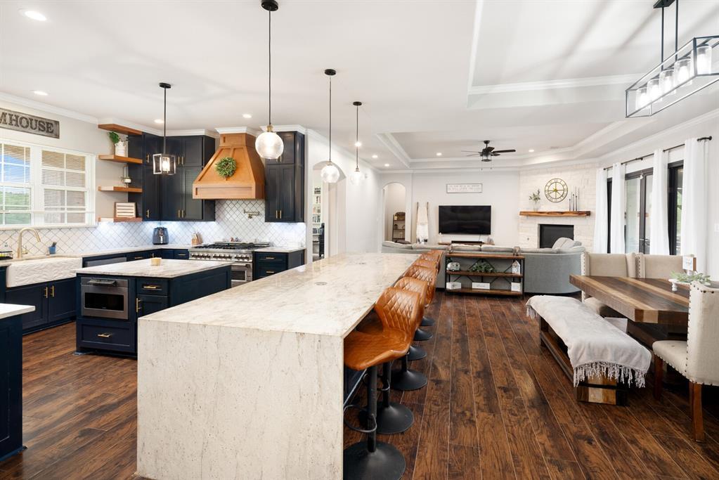 As you enter the drive into 1475 CR 4510, the hilltop custom home will capture your attention! The architecture and finishes are breathtaking, including the copper gutters and roof accents anchored by the rich dark wood finish double garage doors. The foyer welcomes through double doors, this home is inviting, the open concept is designed to include a crowd, yet cozy for daily living. The kitchen is the showstopper with a massive island and waterfall edge, the granite is stunning. Generous floor to ceiling cabinetry, dark rich blue with gold accents, the backsplash adds personality. The additional island is centrally located and houses a microwave, professional grade 7 burner cooktop, and pot filler are ready for a crowd. Two ovens, custom hood, the apron sink is a work of art, this kitchen is full of custom features plus walk in pantry, drink fridge and ice maker. Counter seating for 6-8 in proximity to casual dining area, this home was designed to host! Floor to ceiling stone gas fireplace is a pretty focal point. Amazing office is flooded with natural light, custom built-ins, half bath. Main floor primary has tall ceilings, ensuite with dual vanities, stand alone tub, walk in shower & access to safe room. 4 Total BR - 5.5 BA, massive game room, bonus room, floor plan creates space for both privacy & entertaining. Covered patio is the perfect spot to watch the game! End your day while floating in the above ground pool, enjoy star gazing here in the country - the stars are big and bright! Existing shop is massive, features a kitchen, full bath, washer and dryer connections, spray foam insulation, electricity on a 2nd meter. The land is partially fenced and cross fenced, surrounded by the seclusion the tree grove creates. Located within highly sought after Trenton ISD, super convenient to Sherman, Bonham, Trenton, Anna and Melissa (home of new HEB). Appr. 1 hr to Dallas - DFW Airport. This beautiful home brings country living to the next level.