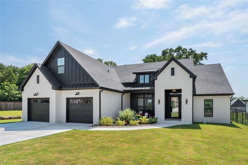 Stunning 2-year-new home in Lone Oak Crossing! This modern farmhouse masterpiece boasts exceptional curb appeal. Step through the grand front veranda and sleek steel and glass door into an open-concept layout, featuring a soaring cathedral ceiling, cozy fireplace, and a dazzling 24-light chandelier. The seamless flow of the dining, kitchen, and great room creates an ideal space for entertaining. The main level includes two bedrooms and a private primary suite, with a fourth bedroom and full bath upstairs for added privacy, which makes a great work from home office as well. The gourmet kitchen impresses with a dedicated vegetable sink, premium appliances, waterfall granite island, and a spacious pantry to keep countertops clutter-free. Farmhouse sink with decorative lighting and shelving overlook backyard and greenbelt. Both sinks have garbage disposals! Thoughtful upgrades shine throughout, including spray foam insulation, dual water heaters, designer lighting, custom tile, and rich wood floors in living areas. Professionally designed closets with custom millwork add a touch of luxury. Enjoy outdoor living on the expansive, fully screened patio, surrounded by elegant wrought iron fencing in the side and back yards. This home delivers every high-end amenity you’d expect and more! Just minutes away from Highport Marina and Tanglewood Golf Course access is at the end of the street!