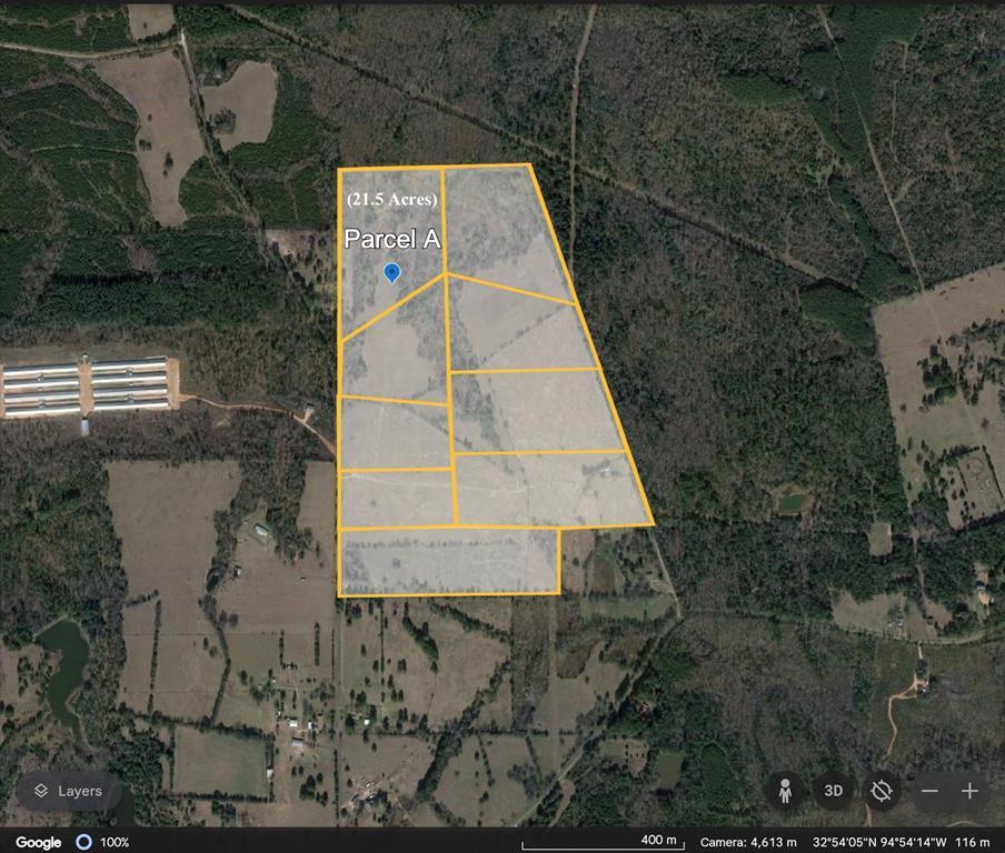 Large, beautiful East Texas property.. This listing is for Parcel A, depicted in the attached photo, and is approximately 21.5 acres at the northwest corner of the subject property. The area is comprised of beautiful rolling land, some wooded area, and pasture acreage that is currently serving as the ranch home of a livestock operation raising bison and cattle. The overall property has premium fencing of 6 ft high, 6 strand wire surrounding the external boundary, with some similar internal fencing separating pastures. It encompasses the northern part of a 232 acre plat, from which ~192 acres will be divided at closing. Parcels A & B have road access at a corner to the parcel, whereas Parcels C through I, have some road frontage. The parcels can be purchased as displayed, or a larger parcel can be created by either combining designated parcels, or by negotiating custom boundaries contained within the overall acreage. The resulting parcel will be re-platted for closing. (The depicted parcel boundaries are approximated from Google Earth.)