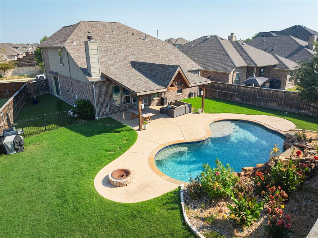 Wait until you see this STUNNING backyard oasis with a sparkling pool and waterfall! Spacious covered back patio perfect for entertaining. Separate fenced area with turf just perfect for a dog run! Access this area by sliding doors, which also allow extra natural light in the kitchen. Enjoy your gorgeous kitchen with sleep quartz counters and bright white cabinets. Living room overlooks the backyard and has a decorative wall with shiplap. Updates include luxury vinyl wood plank floor throughout the ENTIRE home. This home is also located walking distance to a community park. Community boasts two pools, playgrounds, exercise gym, parks and walking trails. Enjoy Prosper ISD schools especially the NEW RICHLAND HIGH SCHOOL. Easy access to the DNT and the Gates of Prosper shopping and restaurants.