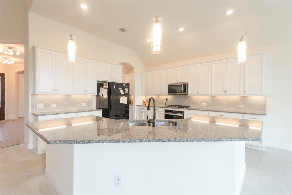 Wonderful open floor plan home in great neighborhood in the heart of Frisco in popular Prosper schools. This terrific home features the primary bedroom, guest suite and office downstairs, along with formal dining area, spacious family room with soaring ceilings, open kitchen with large island and breakfast bar, gas range and abundance of white cabinetry and stylish granite. The open concept living is elevated by the natural light streaming in from the many windows that warms the living and kitchen areas and setting the perfect mood for living and entertaining. The guest bedroom is equipped with ensuite bath and is isolated from primary bedroom. The office is ideally located just off the entry and has French doors to allow for a secluded space for working. The kitchen offers plenty of space for all the chefs to pitch in and help with mealtime and open to the family room so no one misses out on any of the activities going on. The primary suite is isolated at the back of the house and has a sitting area and a bathroom perfect for a relaxing bath, warm shower and getting ready for the day with separate vanities. The backyard has 2 large patios ideal for outdoor entertaining and relaxing. Walk to school is an understatement with the ideal location of this great home! Close to shopping and entertaining and easy access to Hwys 121 & 380.