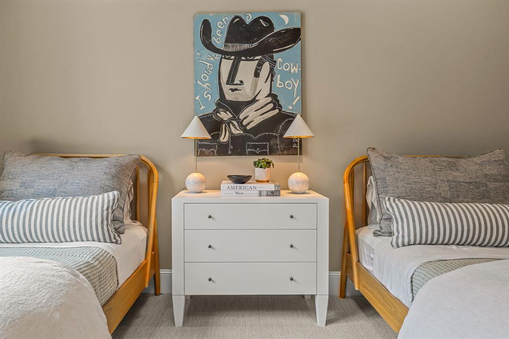 A game table or study nook at the top of the stairs provides treetop views, while an additional balcony offers views of the surroundings. Two spacious bedrooms share a Jack and Jill bathroom and feature natural light, high ceilings, large walk-in closets, and updated wool carpeting.