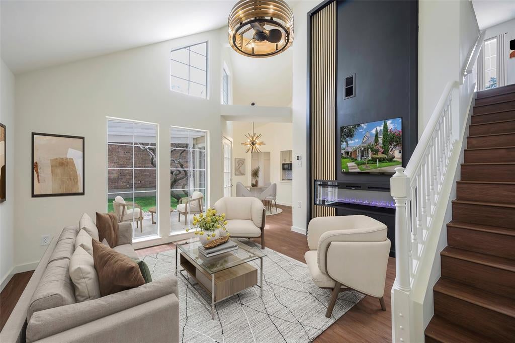 The living room features a custom floor-to-ceiling lighted accent wall, a modern electric fireplace with color-changing settings, and a brand-new Roku widescreen TV.