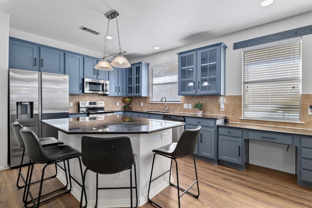 Welcome to this beautiful 1.5 story home situated in the master planned community of Providence Village. Gorgeous, easy to maintain wood-look tile floors invite you inside this 3 bedroom, 2 bath home. Once inside you'll be invited by french doors leading into a private home-office. Make your way into the open-concept entertainment space offering seamless sight-lines from the living room, kitchen and dining area. Entertain friends and family in the light filled living room highlighted by a wood-burning fireplace and wall of windows. Enjoy preparing home-cooked meals in the fully equipped kitchen featuring granite counter-tops, Frigidaire stainless steel appliances, 5-burner electric oven, modern painted cabinets, spacious island and built-in work station. Retreat to the secluded primary bedroom complete with a tranquil ensuite bath with dual sinks, large soaking tub, separate shower and walk-in closet. Two secondary bedrooms share a well-appointed full bath. The whole family will enjoy spending time upstairs in the spacious bonus room with plenty of room for a pool table or used as a media room. A wonderful heated and cooled sun room could be used as a play room or whatever your families needs require. Kids and pets will love spending time outdoors with a paved patio and storage shed.